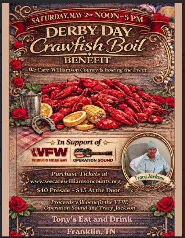 Saturday, May 2nd There is an organization here in Williamson County called We Care Williamson County that raises money for worthy causes every year. This year, they are including a charity I started called Operation Sound. What my charity does is provide musical instruments for veterans who want to learn to play. They will be holding a Crawfish Boil on Saturday, May 2nd from noon to 5 pm at Tony's Eat and Drink in Franklin. You can also donate on their website.