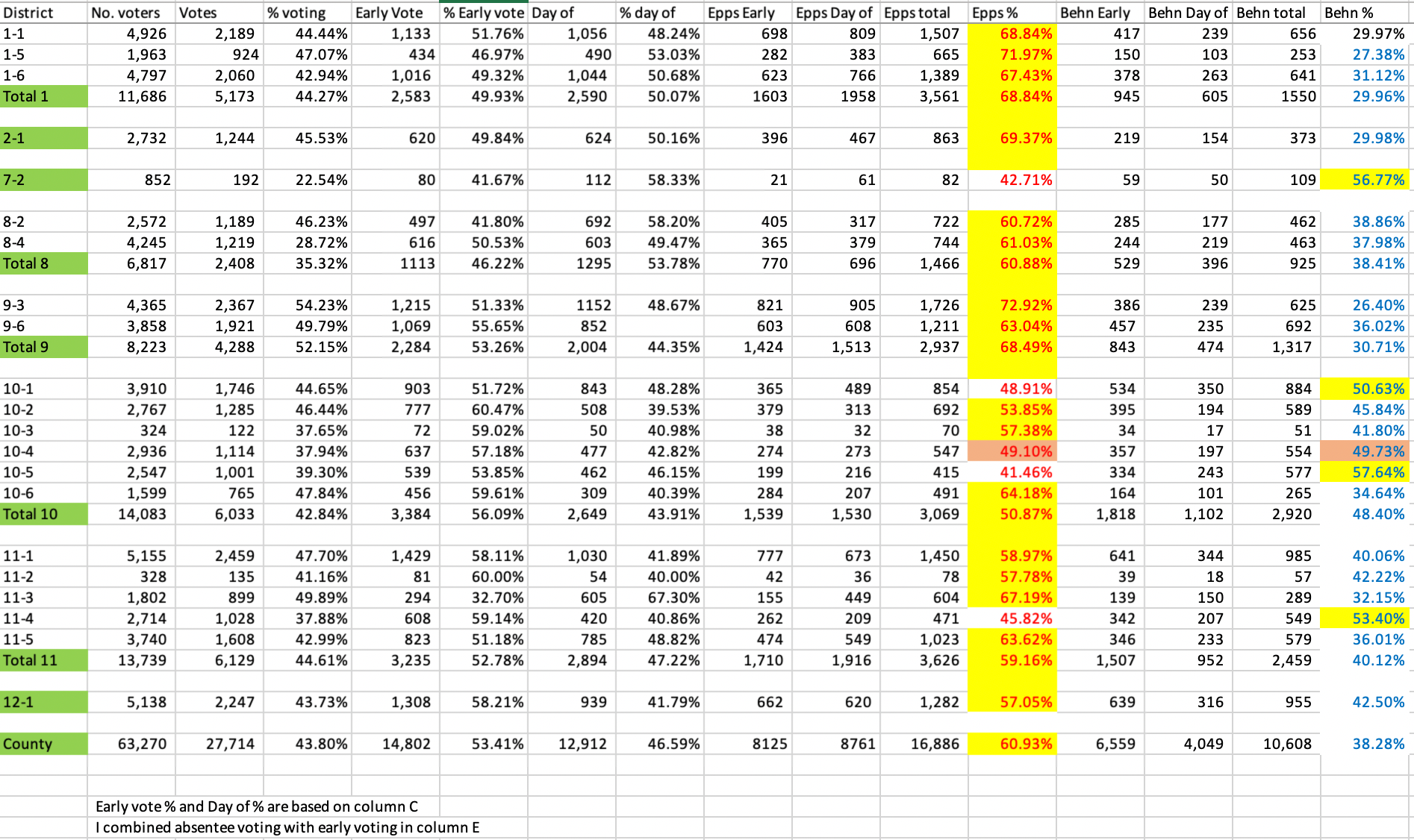- Total turnout was 14,800 early and absentee voters plus 12,900 election day voters for 27,716 total, representing nearly 50% of active voter registrations