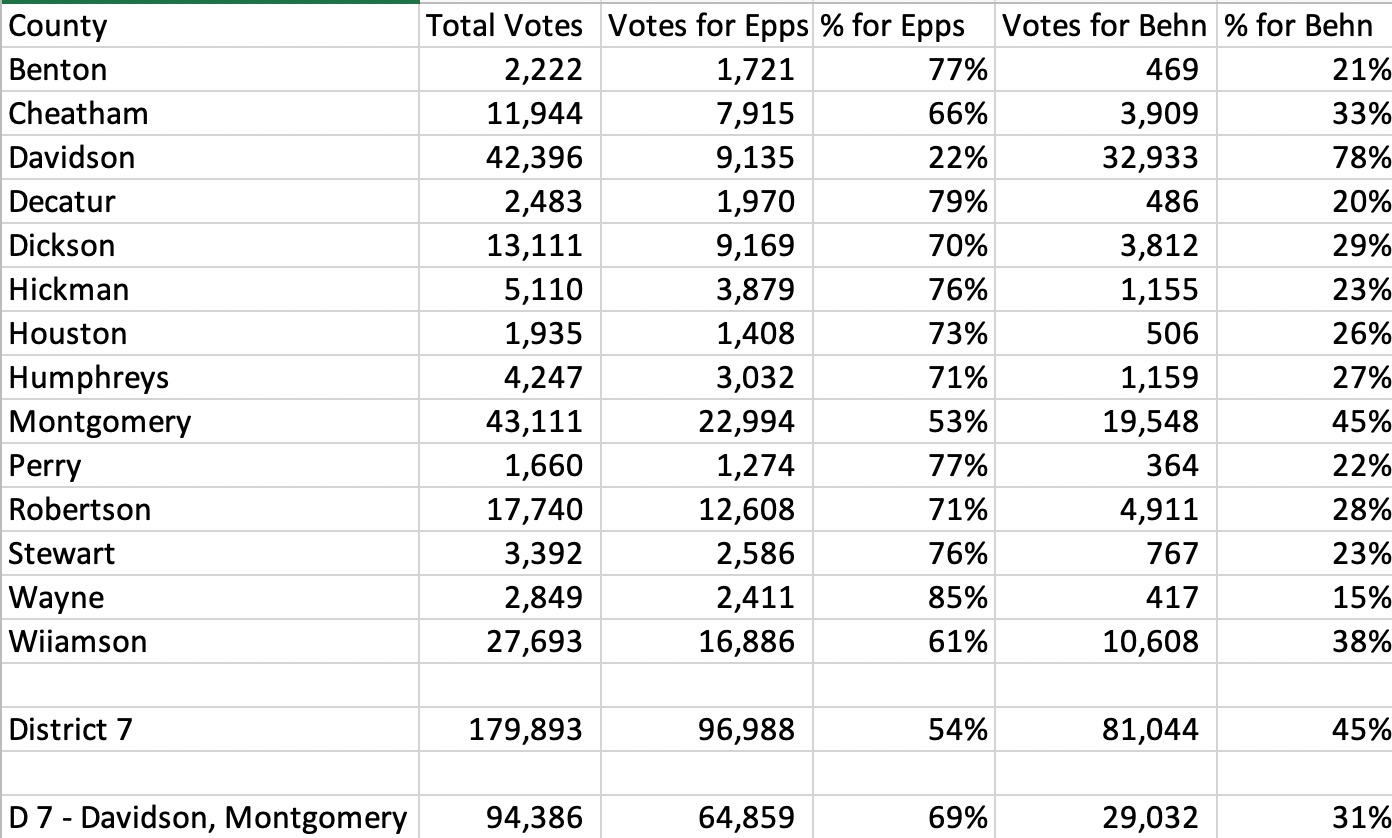 By now the whole world knows that Matt Van Epps is our new U.S. Representative for Tennessee District 7. He won by 9% in a district that Trump won by 20%. Here are some stats from the election. The first is all counties results. You will notice that there is a discrepancy between the two spreadsheets regarding total votes for Williamson County; that is because the state doesn't count write-ins, undervotes or overvotes which, combined, accounts for the 21 vote difference.