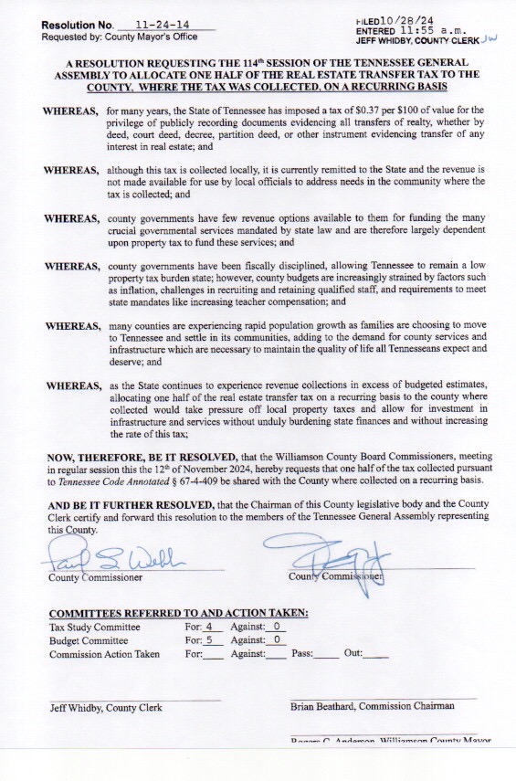 Recently, the Williamson County Commission passed a resolution appealing to the Tennessee General Assembly to amend T.C.A. 67-4-409 that requires all counties to collect $.37 per $100 of assed value for every real estate transfer and send that money to the state. Last year that amounted to $28m from Williamson County. The resolution is asking that we get 1/2 of those monies returned to us and I have attached the actual resolution below.