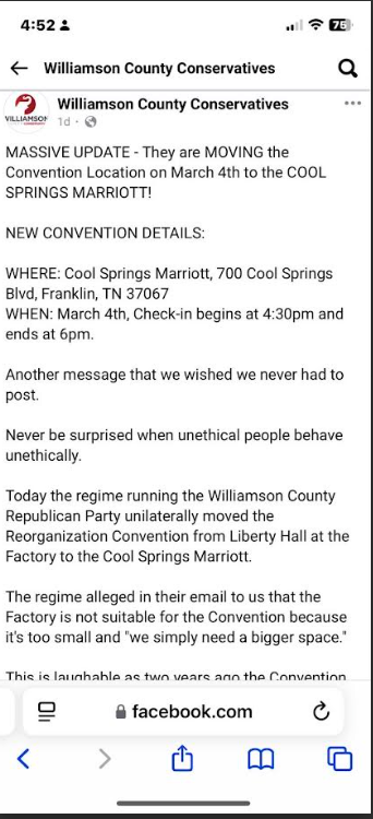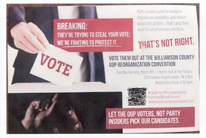 At the moment there is a bill before the General Assembly (HB1159/SB0831) sponsored by Senator Joey Hensley and Rep. Susan Lynn to implement party registration. It was requested by the Tennessee GOP and supported by the Williamson County Republican Party and is strongly advocated by Elevate 2025. This is the best way forward to close primaries, but the WCC group doesn’t tell voters that in their disinformation nor do they appear to support the bills.