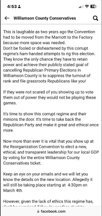 It is ironic that the very people who are accusing the current GOP of wanting to disenfranchise Republican voters by using a convention to choose republican candidates are involved in the very thing they claim to be against. News flash, the reorganization convention scheduled for March 4th is a convention where only qualified participants AKA bona fide Republicans can vote, and it is a one-day event where the infirm, military, etc. will not be able to attend. The same as in past conventions in 2023, 2021, 2019, etc.