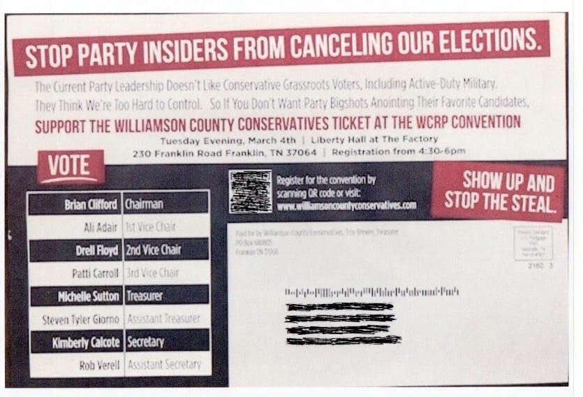 Here is their latest mailer. Tell me where they mention their solutions or their vision for the future of the GOP in Williamson County other than voting out the current leadership.