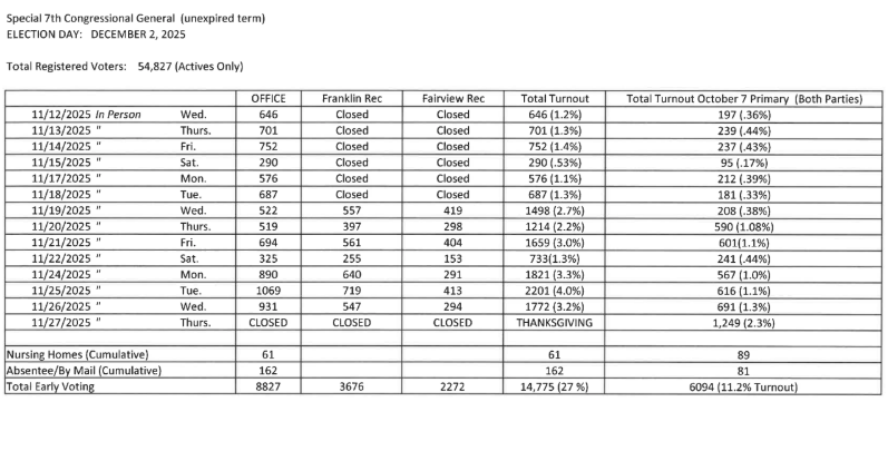 Eight of the twelve districts in Williamson County are also in District 7 for U.S. Representative. I am listing the % of votes from each district as well as the total number of votes for all eight in early voting.