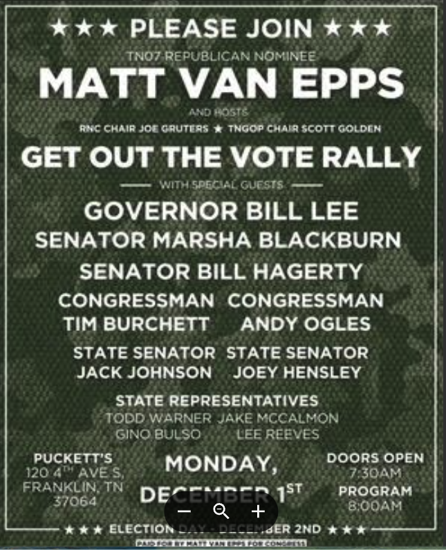 We all need to get behind our Republican candidate Matt Van Epps as this is not a lay down election. The Democrats are well organized and energized. As I mentioned earlier, the vote differential between Republicans and Democrats in the recent primary was only 18%, 36,854 Republicans to 31,002 Democrats for a difference of only 5,852 votes. The Democrat establishment is zeroing in on this election and if they can flip this seat to blue, it will change the dynamic in Washington and give the Democrats a win that will reverberate around the country. We cannot let this happen.