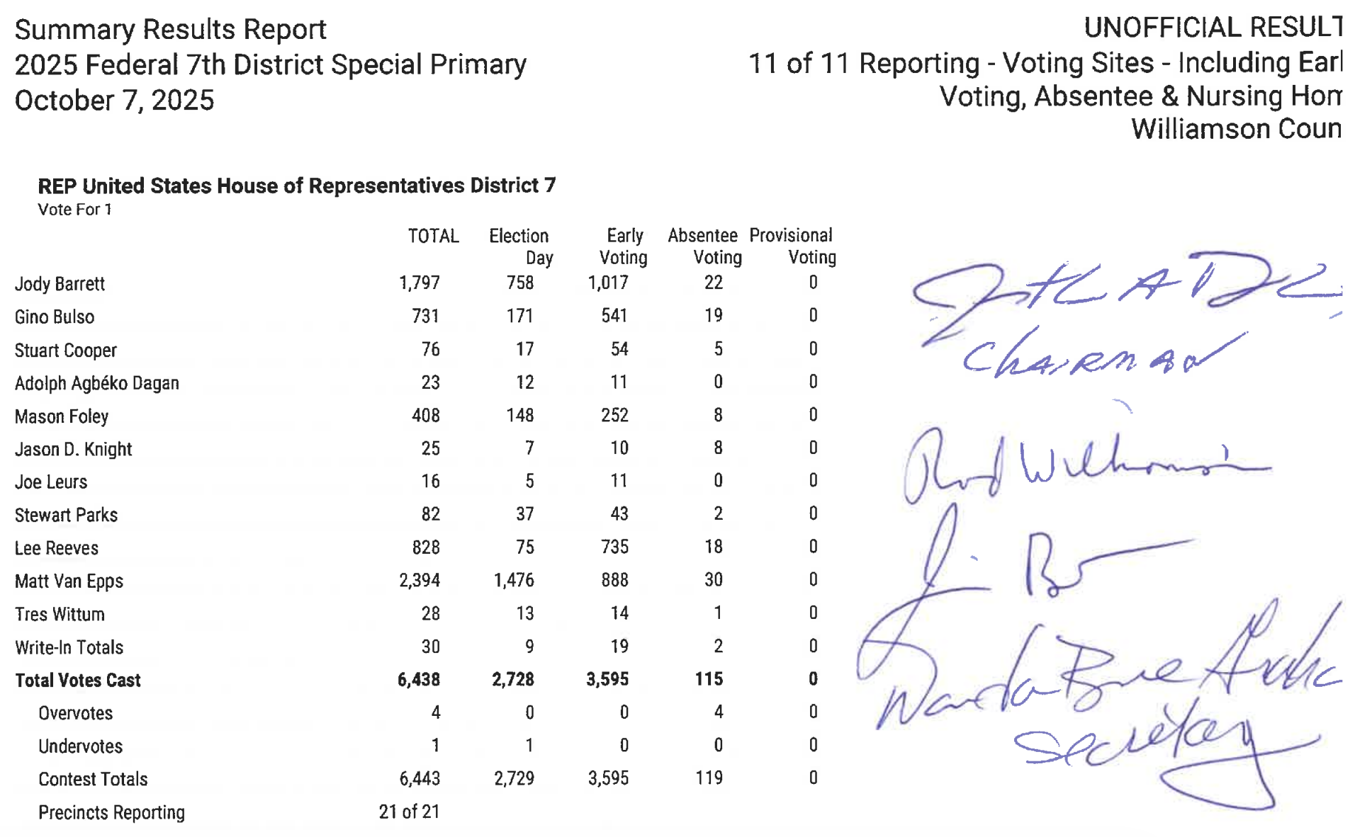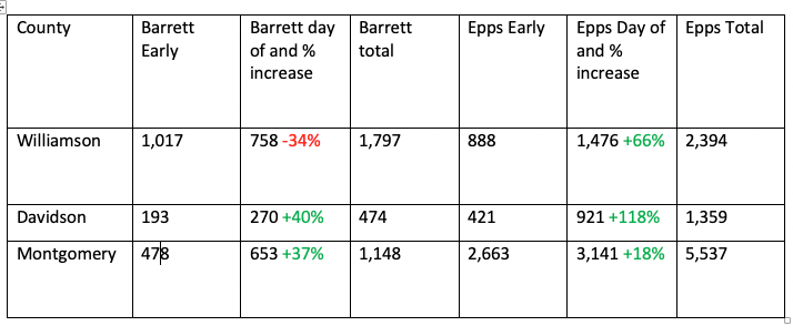 As you can see, Williamson County flipped for Van Epps on election day. Jody had the lead after early voting, but Epps got almost twice as many votes on election day.